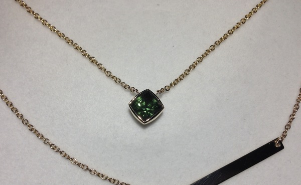 The sapphire is a beautiful, rich green and very unique. I think it would be excellent kept as is in the pendant or set into a ring (with claw prongs!). The gold complements the beauty of the stone. It is an elegant piece and its beauty exceeds what my phone could capture!