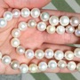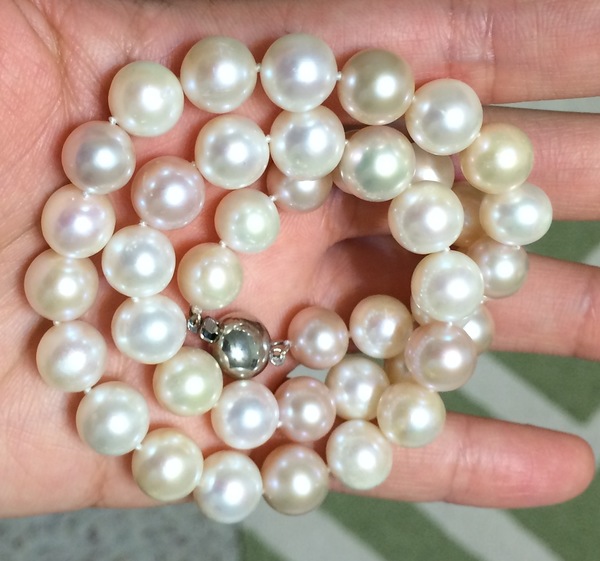 These are 9.5mm (Back) - 11mm (middle to front) Freshwater Pearl Necklace that I bought about a year and a half ago in Japan. It has NEVER been worn outside the house. As a result, the silk knots between each pearls are still very very tight! The pearls have gorgeous overtone and optimal orient effect. They are on the very round side for a pearl necklace but some pearls do have natural pearl blemishes (ex. as you can see marked in the picture) and slightly marked surface.