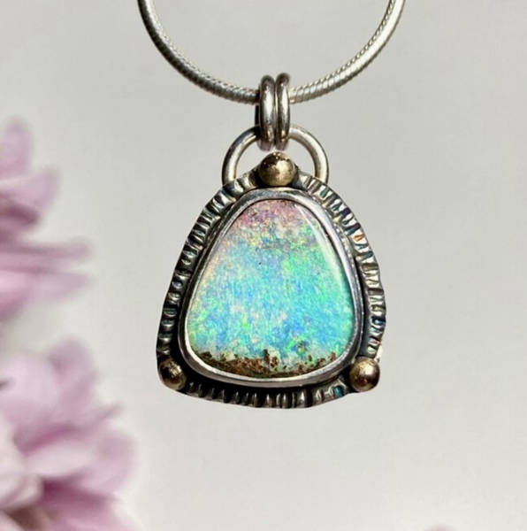 For sale is a handmade Australian opal necklace. The opal is very shimmery with lots of aqua and pink. The snake chain and pendant are sterling silver. The pendant features solid 9k yellow gold ball accents.