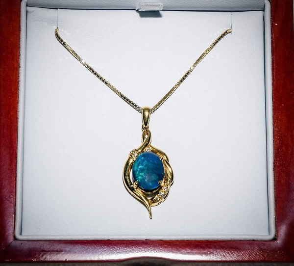 Beautiful Solid Black opal 18K Gold and Diamond pendant. Box link chain in picture not included. Comes with Cherry wood gift box.