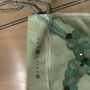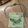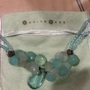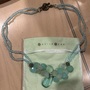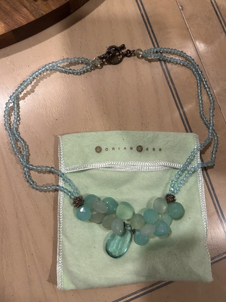 Necklace with 3 sizes of turquoise color stones: 2 strands of blue/green clear small beads, 8 medium size, pear shape stones varying blue/green opaque shades, 1 large clear center stone medium blue teardrop shape; silver toggle. Ocean themed collection of approx 2007/8.