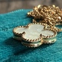I’m cutting down my collection of pendant. This is my VCA inspired Mother of Pearl necklace I commissioned. It is in beautiful 18kt rose gold with Italian cut chain. The chain easily sparkles in any lighting. Dimension of clover 15x15mm and 3mm thick. The chain is 18 inches long. There is a slight scratch on the pearl hence the price.