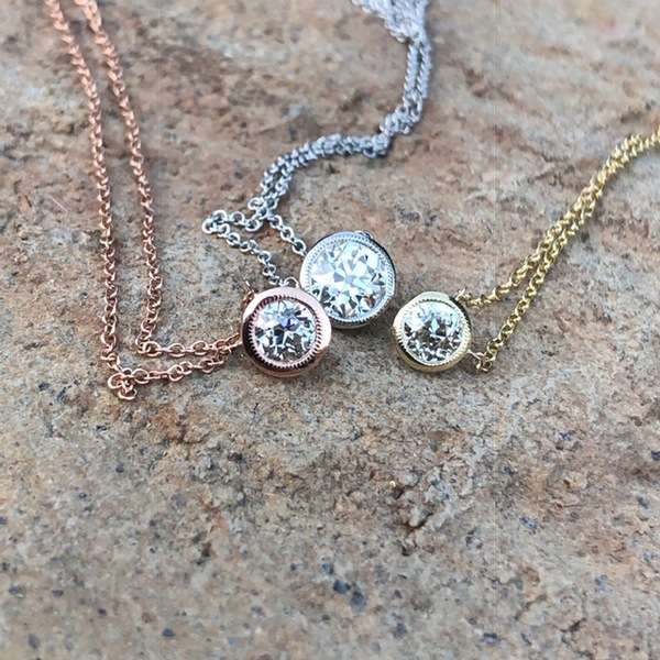 ~SOLD~ ** 14k rose gold featuring a .40ct J/SI1 OEC with the full bezel measuring 5.89 x 5.94mm. The necklace weighs 1.48g. Asking $750
