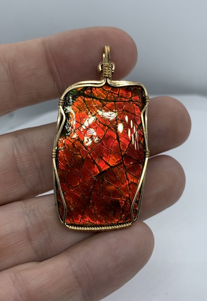 STUNNING Large Ammolite Wire Wrapped Pendant Red to Green color change