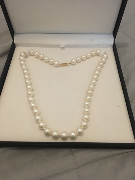 I received a beautiful Akoya Pearl necklace from my now ex boyfriend last year. They are 9-10mm AAA quality white Akoya pearls on a silk princess length strand and a 14k gold lobster clasp. I have never worn them, and frankly I don’t want to keep anything around from him. They are from The Pearl Source and are on sale right now for $3499 on their website. Obviously I’m not selling them for that much because I don’t have the receipt, but I included a stock photo of the actual necklace as well as my own pictures. Comes in blue gift box as shown.