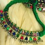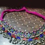 This glamorous piece of tribal necklace is from the Turkmen tribe. Assembled on fiber this ethnic piece contains green, blue and pink glass stones on the top and drooping red and blue glass stones with rhythmic bells at the bottom side of the necklace. Silver bells make this item more fascinating and musical at the same time.