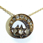 Featuring a lovely Victorian Rose cut diamond crescent Jewish star necklace. Set with 0.23 ctw rose cut diamonds, F SI1. Set in stamped 14K yellow gold. The chain is 16” in length. Shipping included if located in the US.