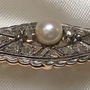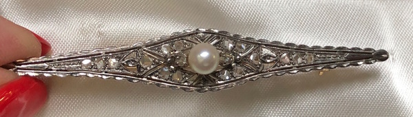 46 points of old cut diamonds set in white gold, finished with milgrain detailing and a pin stem clasp.