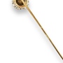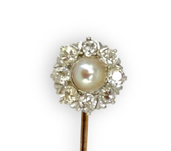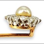 This is a beautiful vintage 14k yellow gold platinum topped pearl and diamond stick pin. I had intended to convert to a ring but don’t feel like taking a project right now. Measuring 2.95 inches in length with a 5.3 mm cream pearl center stone. Pearl has a strong luster and is surrounded by a halo or OECs at approximately 2.9 mm each. 2.7 grams total.
