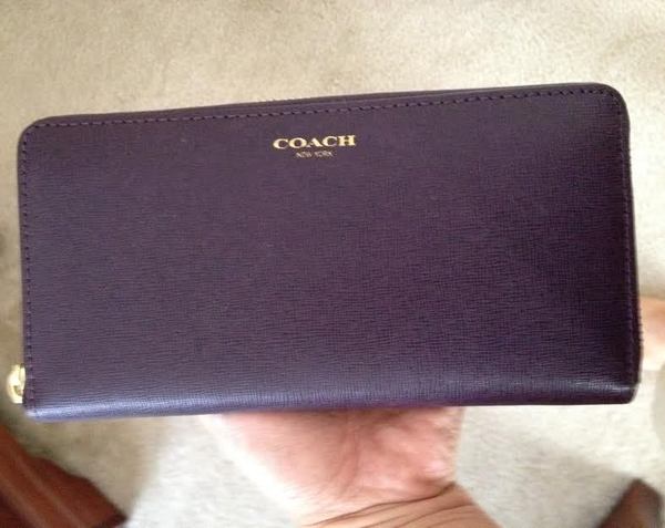 For sale a 5 month old Coach zippy wallet in a dark wine purple. I purchased it mid December 2013 at Macy's. The credit card slots are tight, the leather still smells like a strong leather smell, and this is in extremely good condition.