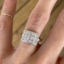 The elongated cushion-cut center stone is exceptionally sparkly and flattering — very bright, very clear, and eye-catching without being overly bulky due to the elegant cut.