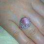 6.19 ct. (10.32 x 9.10 x 4.21) with G/H SI .54 diamonds bubble gum pink "star" sapphire. The stone is semi-translucent, but is heavily included which means you don't always get an actual star when it's in the light. I would consider it an included semi-translucent bubble gum pink cabochon sapphire that occasionally produces a star. This is more of a "fun" stone, but it's in a very nice platinum setting with nice diamonds. I'm only selling because I'd have to have it rebuilt to wear it.