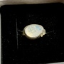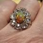 The center stone is an 8 x 10 natural Welo Fire Opal set in 14kwg with rose cut moissanite side stones. Ring is a generous size 7.5. The rose cut moissys reflect the light similar to a natural rose cut diamond. My jeweler who does most of my sizing and stone setting, who seldom mentions my "fun" rings, was impressed with how well this turned out when they set the opal for me. Ring weighs just over 5 gr. I'm the original owner of the ring.
