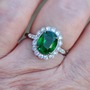 3.09ct Tsavorite garnet - 9.44 x 7.65 x 5.17mm. Setting was made for the stone by the seller. G - VS2 diamonds, but that's the seller's info, the GIA cert is just for the stone. Some typical Tsavorite inclusions, but eye clean at normal viewing distance. Size 7. Like new condition. Fourth photo is next to YAG "tsavorite" which will be for sale in a different listing.