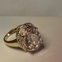 It is a 14k yellow gold ring with a morganite oval center 18mm x 10mm with small mined side diamonds. The ring is size 6, sizable. Weighs 5.4 gram.