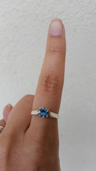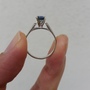 Set in a sterling silver cathedral setting. It was sold to me as a size 6 but on my ring mandrel it comes down to 6 1/4. The setting could use a good polish and the prongs probably need to be tightened/straightened.
