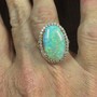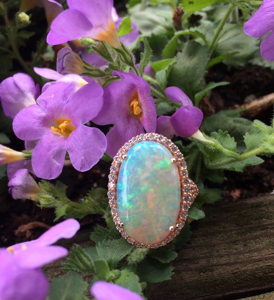This is a one-of-a-kind opal ring. The setting was made to hold this large stone! Opal is 9.16 ct oval natural opal. The halo contains 0.70 ctw natural round diamonds (si1, H/I color) size 6.0