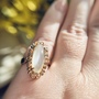 $999 via Zelle 1050 via Paypal. Beautifully detailed scalloped detailing enhances a lovely large oval Moonstone Cabochon in this Retro 1940s Era Cocktail Ring. Ready to be worn and adored by a new owner this well crafted ring weighs a hefty 6.16g in 14k Rose Gold, indistinctly stamped, tested for content. Currently a size 6 and sizable, Inquire for a sizing quote. This vintage ring was lightly worn and remains excellent condition for its age. The Moonstone is approximately 7.25 carats by measurement and is white with a strong white cat's eye adularescence. The measurement of the face of the ring including the decorative halo surround is approximately 23mm long by 12mm wide. This ring is sure to be a welcome addition to any jewelry collection. Video available for immediate viewing on my Instagram Vanessaatheritagejewelry or by a requested you tube video link. Layaway available.