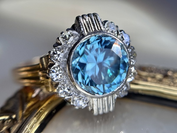 Center Stone: Natural Blue Zircon, approx. 8 mm round