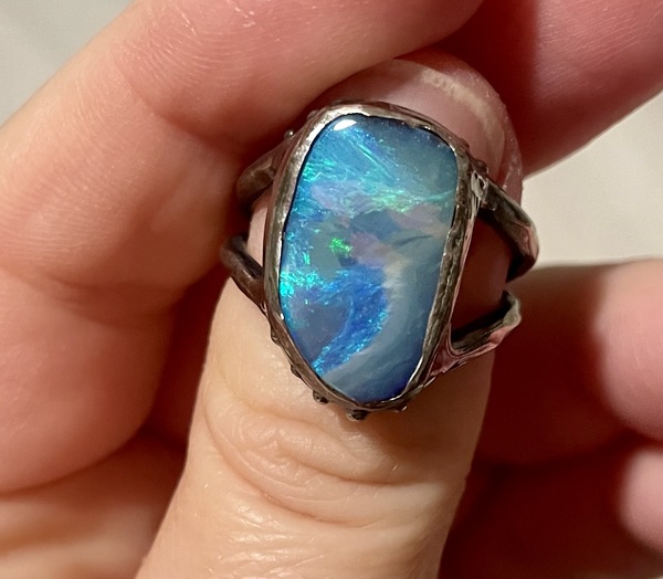 For sale is a stunning & substantial Australian crystal opal ring purchased from Far North Gems on Etsy. This piece was custom made and is done in oxidized sterling silver. It is a size 8.