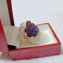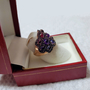 I really hate to sell this ring. I know it's not particularly valuable, but it's so unique. I just need to let some of these pieces go to new homes. I call it my "mixed berries" ring. It consists of oval cabochons and faceted round melee in 3 yummy gems... pink garnet, purple amethyst, and blue iolite. As you can see, the colors have an ombre effect. The ring is cast in solid 14k rose gold, and the pave mountings are plated in black rhodium for a super rich effect. The ring measures approximately 28mm long (north-south). I am unsure of total carat weight, but there's a really nice presence. Ring is a size 6 US (resizable).