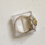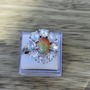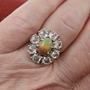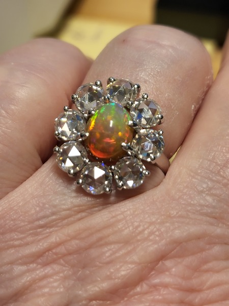 The center stone is an 8 x 10 natural Welo Fire Opal set in 14kwg with rose cut moissanite side stones. Ring is a generous size 7.5. The rose cut moissys reflect the light similar to a natural rose cut diamond. My jeweler who does most of my sizing and stone setting, who seldom mentions my "fun" rings, was impressed with how well this turned out when they set the opal for me. Ring weighs just over 5 gr. I'm the original owner of the ring.