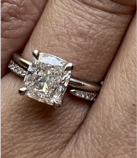 This ring is a Ken & Dana Design crafted piece. Take a look at their website to see their work. The ring was sent to eBay Authentication and has been successfully authenticated. I will include all the paperwork I originally received with the ring as well as the eBay authentication cards. All details are listed under the item specifics. The platinum setting is modern and minimal, but extremely well made and solid. It makes the cushion cut stone the center of attention and the claw prongs elevate the piece. I was able to stack this ring with a ring cuff and wedding band (cuff and band not included). This is an absolutely beautiful engagement ring, but my husband purchased a new ring for me for our anniversary.