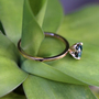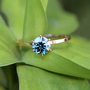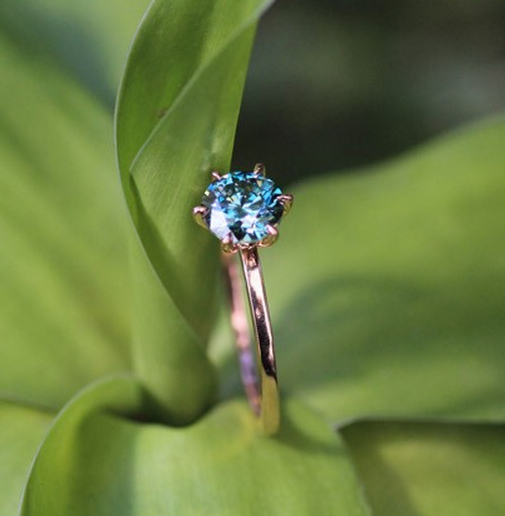 Center Stone: Blue Amora Moissanite (6mm/ .75 diamond ctw) from Betterthandiamond.com