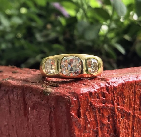 A gorgeous antique cushion cut moissanite ring set in 10k yellow gold. The largest old mine cut moissanite is 7x7 mm and the smaller two are 5x5 mm. The ring measures approximately 8 mm across the top and 2 mm at its thinnest. It is very comfortable and sits low on the finger.