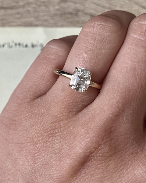 8mm x 6.5mm antique cut cushion (old mine cut) GH colored moissanite in low profile 9K yellow gold with 4 claw prongs solitaire setting. This is brand new and only worn to try on. Price includes USPS shipping. Email me for videos/more info. Thanks for looking!