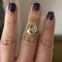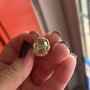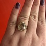 A beautiful champagne oval cut moissanite cocktail ring. The champagne moissanite measures 12x9 mm and has an stunning presence on the hand. Ring weighs 4 g and the band is 2 mm at its narrowest. It is stamped 14k yellow gold. Size 6 and fully sizeable.