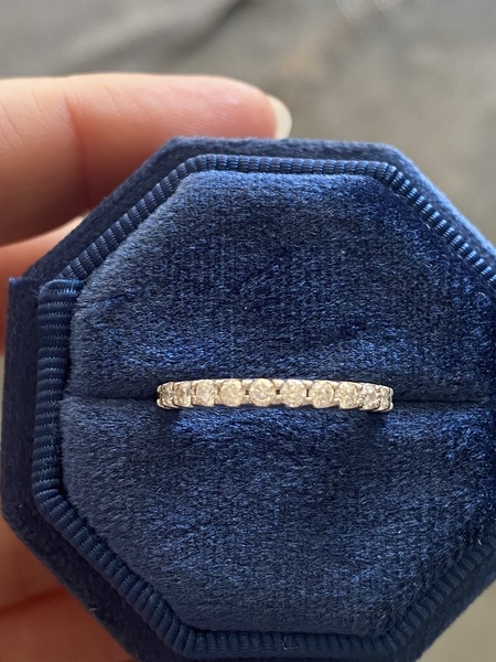 Gently used moissanite eternity ring, size 4.75 in palladium for sale. It is low profile and goes with most engagement rings. Only selling because I need a different size. The ring is from