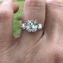 Three stone moissanite ring made by Jonathan at August Vintage. Center stone is AV rectangular cushion 8.5mm 2.54ct GH VS, side stones are 4mm AV OEC. Ring is 14k white gold size 6 and has only been worn a few times so is like new.