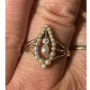 In my 30 years of collecting vintage jewelry I’ve never seen another ring like this one. It’s a vintage art nouveau Navette, pearl and diamond ring. The diamond is crisp and clear and bezel set with milgrain work. It’s 10 karat yellow gold with a triple split shank. Has graduated round pearls with a teardrop shape in the center. Size 8.5 and fully size able. It does appear a few pearls have been replaced. But it’s still a beautiful piece from the late 1800s. I found a stick pin that's $350. It's the only other piece I've seen remotely like this. I just can't wear pearls. I tend to put my rings on and wear them for months.
