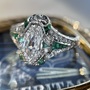 This superb Platinum Engagement or Cocktail ring from the Edwardian to early Art Deco era shows the mastery of gem-cutting and setting that jewelers attained in the early decades of the 20th century. This ring, with its elegant ‘Navette’ shape, is centered on a marquise-cut diamond, which is ingeniously surrounded by seamlessly set calibré-cut emeralds. Bordered by glittering circular-cut diamonds, this is a perfect example of a striking yet wearable early 20th century jewel. This ring is certainly among the most beautiful we have had to offer at Heritage Jewelry and it has been a delight to be able to admire such a piece of artistry in person. Our 0% Interest Layaway Plan makes it easy to plan for special occasions like anniversaries or holidays. Video is available of all our fine jewelry items by viewing our Instagram page Vanessaatheritagejewelry or by requesting a video link. www.Heitagejewelry.com
