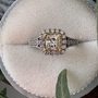 Ring is a stunning 14k white gold engraved vintage inspired band with a 1ct light yellow princess cut natural diamond J color, VS2 clarity. Halo and band has a total of 26 white sparkling diamonds, size 8 currently and sizable. Comes with appraisal of $11,000 CAD.