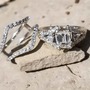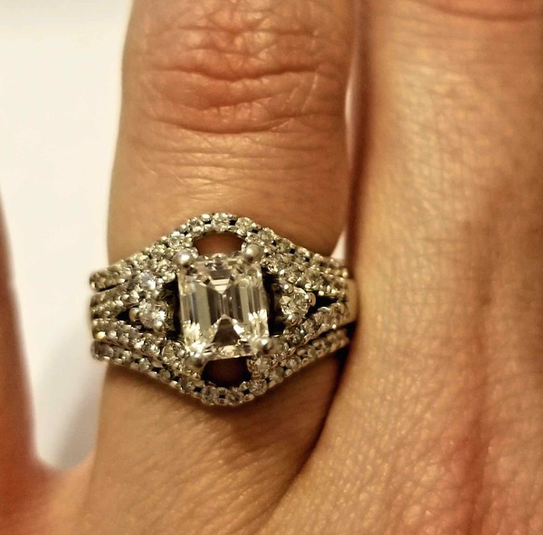 The 14K white gold engagement ring is center set with an Emerald Cut diamond in a four prong head, measures approximately 6.02 x 4.81 x 3.90mm, approximate weight 1.02 carats, graded VS1 clarity and G in color with good polish and symmetry. At the center of the Split Shank is a prong set 0.02 carat round brilliant cut diamond. The split shank each side prong set with fourteen (14) 0.01 carat Round Brilliant cut diamonds. The approximate total weight of the round diamonds is 0.32 carats, graded SI1 Clarity and H/I in color. The approximate total diamond weight in the ring is 1.34 carats and the ring weighs 4.80 grams complete.