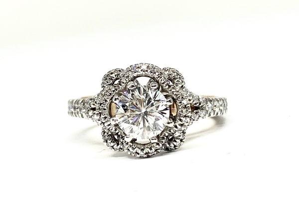 18k White and rose gold Verragio engagement ring. Center stone is a Leo cut GIA certified .99 carat round brilliant cut diamond. The color is F and the clarity is SI1. The center stone is accented by .62 carats of pavé diamonds. This is an absolutely stunning setting with so much character and detail. Ring is currently a size 5.75. Appraisal and free sizing included with your purchase. This ring is located at Franklin Fine Jewelry in the heart of downtown Franklin, Tennessee. Contact Maira at mlimajewelry@gmail.com with any questions. Follow me on Instagram @Mlimajewelry to see other available styles and custom designs.