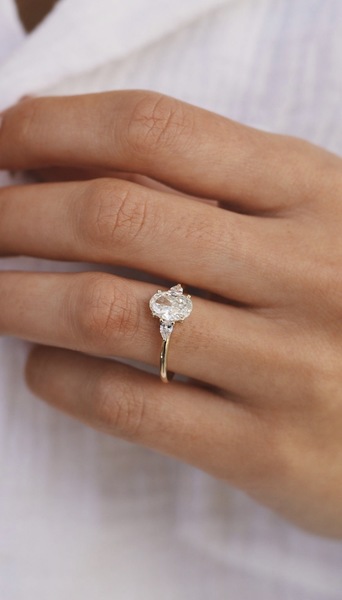 This is a gorgeous 1.77 total carat weight diamond engagement ring with 1.53 ct natural oval clarity enhanced diamond in the center and two natural pear diamonds on the sides totaling .24 ct.