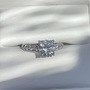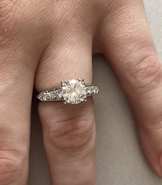 This ring weighs 3 dwt with a transitional round cut diamond that is flanked with three transitional round cut diamonds mounted down each side of the shank of the ring. The center diamond is approximately 1.49ct with the six diamonds around it measuring approximately .46ct (diamonds have never been removed from the setting to figure out the true weight).