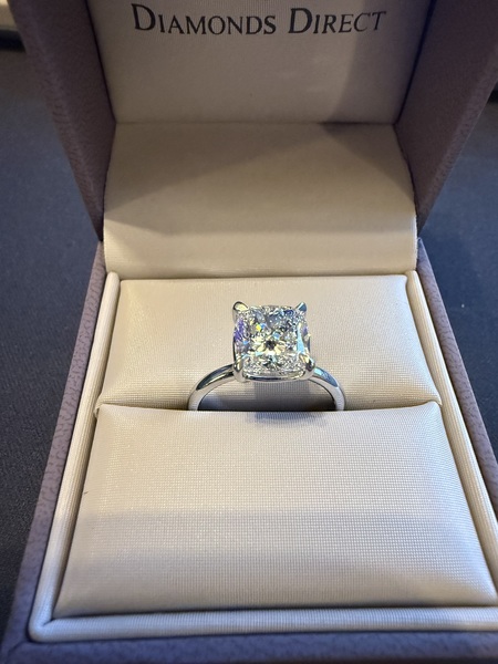 Offered is a stunning GIA-certified 3.02 carat Cushion Modified Brilliant diamond set in a classic 14k white gold solitaire mounting, purchased from Diamonds Direct. This ring combines exceptional brilliance with timeless elegance, making it perfect for someone looking for a truly special piece.