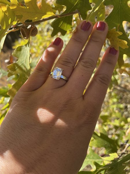 Hi - I am SandyK on Pricescope and have a SMTB thread and additional ASET images on PS. The center stone is a natural emerald cut diamond, 3.02 carats, F, VS2, GIA number 5192526376. It was sourced by IDJ and has amazing light performance and is icy white and completely clear. The setting is a custom hand forged platinum solitaire by Maytal Hannah. Only selling due to some completely unexpected personal circumstances.