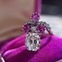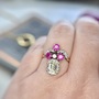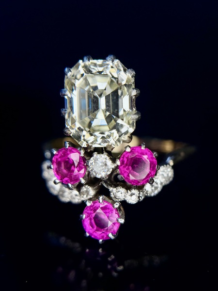 At its heart rests a remarkable natural antique emerald-cut diamond of 2.96 carats, with VS1 clarity and warm O–P color, its elongated facets glowing softly in any light. Surrounding the center stone are antique old mine–cut diamonds and vibrant natural unheated Burmese rubies, arranged in a tiara-inspired setting of 18k yellow gold and platinum. The center and accent gemstones combined equal 4.22 carats total weight.