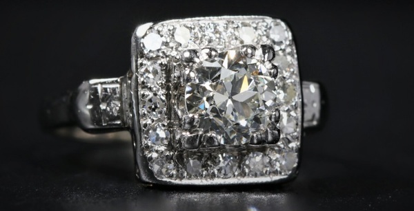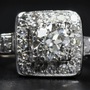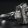 Art Deco 14k white gold and diamond ring. This stunning ring is set with a 0.76 carat Old European cut diamond (VS2, H/I) at the center of a beautiful square-shaped mounting. Sixteen single cut diamonds totaling 0.25 carats (VS2/SI1, G/H) are set in the sparkling halo. Milgrain detailing travels along the soft edges of the halo while delicate hand engraving lines the shoulders. The ring is a size 5. There are 4 photos of the ring attached as well as a screenshot of the portion of the appraisal which was done in February of 2025 that shows the description and appraisal value. Price is negotiable, so if you have an offer, please feel free to reach out.