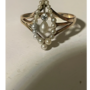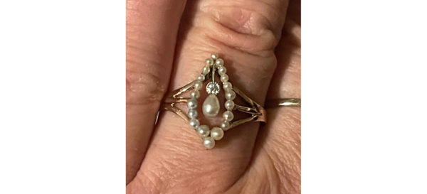 In my 30 years of collecting vintage jewelry I’ve never seen another ring like this one. It’s a vintage art nouveau Navette, pearl and diamond ring. The diamond is crisp and clear and bezel set with milgrain work. It’s 10 karat yellow gold with a triple split shank. Has graduated round pearls with a teardrop shape in the center. Size 8.5 and fully size able. It does appear a few pearls have been replaced. But it’s still a beautiful piece from the late 1800s. I found a stick pin that's $350. It's the only other piece I've seen remotely like this. I just can't wear pearls. I tend to put my rings on and wear them for months.