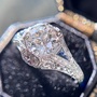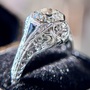 At the heart of the ring rests a completely eye-clean Old European Cut diamond, sparkling with the soft, romantic light that only an antique cut can offer. The diamond’s character-rich faceting creates large flashes of brilliance, while its medium culet and small table speak to the artistry of a bygone era. Though graded I1, the only clarity feature is a delicate edge feather so well concealed within the faceting that it took magnification and a jeweler’s loupe to locate—the stone is both beautifully clean and bright to the naked eye. The diamond is framed by an exquisite floral setting crafted by the renowned Belais workshop, celebrated for its refined metalwork and pioneering use of white gold. Two custom-cut triangular blue sapphires accent the design, adding a subtle yet striking touch of color that enhances the ring’s romantic presence without overwhelming its delicate balance. Elegant, feminine, and rich with history, this ring is a timeless expression of love—thoughtfully restored, beautifully preserved, and ready to begin its next chapter. In person viewings are available by appointment at our Edmond, Ok office. 0% Interest Layaway Plans up to 7 months make it easy to plan for special events such as anniversaries, birthdays and holidays! Video available by request. www.HeritageJewelry.com
