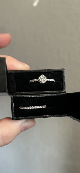 Putting out feelers for this set. I would rather them sell together. E-ring is .82 ct, AGS, K VVS2, and medium blue Fluor! One of THE BEST K’s I’ve seen! Both rings are 14k and size 7 3/4. Both are low profile and 1.5 mm wide. Both are half eternity, so if you need them to be sized, I’m sure it wouldn’t be an issue. The setting/band were purchased through BlushKarats on Etsy.