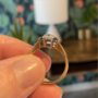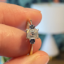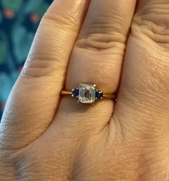 The bright sparkling emerald cut diamond at the centre of this three stone ring is beautiful and complemented perfectly by a sapphire either side. The stones are set in platinum and the band is modelled in 18ct gold. Diamond has inclusions which can be seen in photos and priced for that! Measuring 65pts, the diamond is a lovely size and the sapphires measure 5pts each