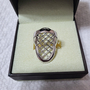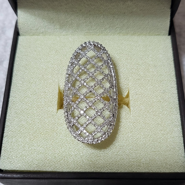 This is just a fun piece... great finger coverage, measuring around 34mm long (north-south). Total carat weight is approximately 1.10ctw. The diamonds are G-H in color and SI1-2 clarity. The ring is a size 6 US and finished in solid 14k white gold (resizable).