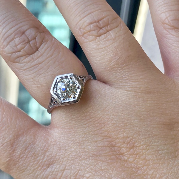 Hello! I am selling my recently purchased 0.98ct M VS1 OEC diamond ring in an 18k gold vintage setting. The diamond is very crispy and has beautiful fire! It faces up pretty white (compared with my G colored round brilliant in the pictures -- the round brilliant is not for sale.) The ring itself offers GREAT coverage. Makes the stone look bigger than my 1.22 round brilliant! I have the GIA certificate and will include it with the stone.